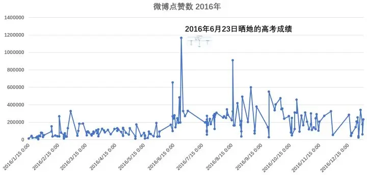 那一年,她的人气也只是网红级别,爬取她的微博数据,从她微博被点赞的数量可见一斑。