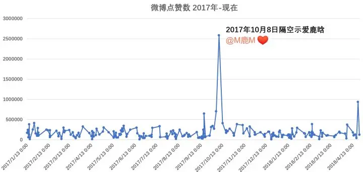 有趣的是,跟鹿晗在一起并没有给她带来更多的铁粉,这点从她微博被点赞数可以看粗来,在一起后她的被点赞数不升反降,2017年底到2018年维持在 10-30万 之间。