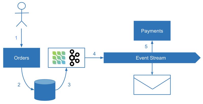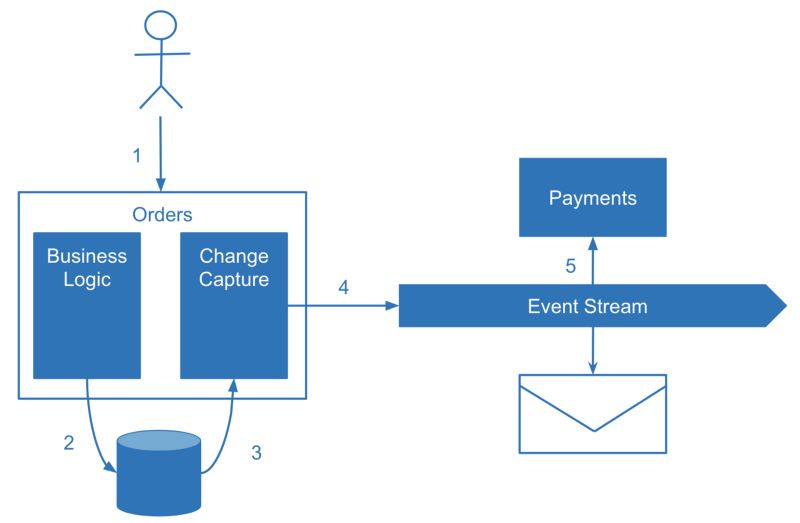 在主要业务操作中,我们修改自己的服务状态,而单独的流程则可靠地捕获相关变更并生成事件。这种技术被称为变更数据捕获(CDC)。实现此方法的一些技术包括 Kafka Connect(http://t.cn/EzrZOpE)或 Debezium (https://debezium.io/ )。