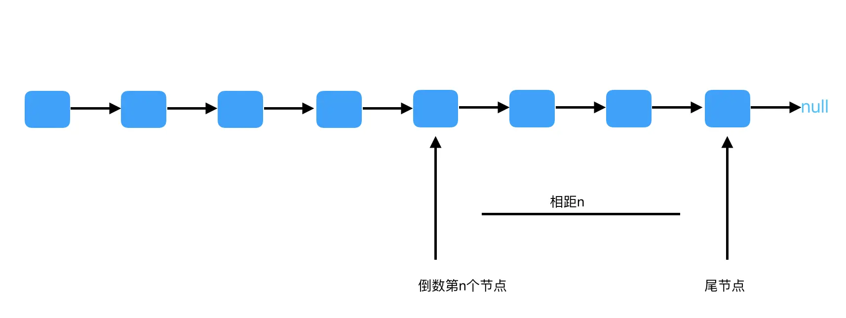 困难处:单链表要遍历才能知道链表长度,而且求倒数第n个,逆向链表也不好做。 思路:在链表中如果涉及到位置,可以试试用两个指针来解决问题,两个指针相距固定位置一同向前移动/两个步伐不同的快慢指针。如:查找中间节点使用2倍速度的快慢指针。