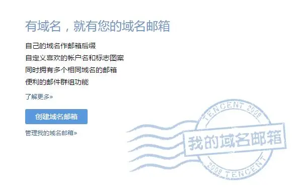有了域名后,就可以先给自己设置企业邮箱了。很多企业邮箱服务是另外付费的。其实,没有必要。腾讯提供了免费的企业域名邮箱,并且可以绑定你的QQ邮箱。也就是说,用QQ邮箱去收你的企业邮箱,管理界面也在你的QQ邮箱里面,方便快捷。操作很简单,domain.mail.qq.com/ 开通,完成域名解析,几分钟后,以你官方域名为后缀的企业邮箱就开通了。