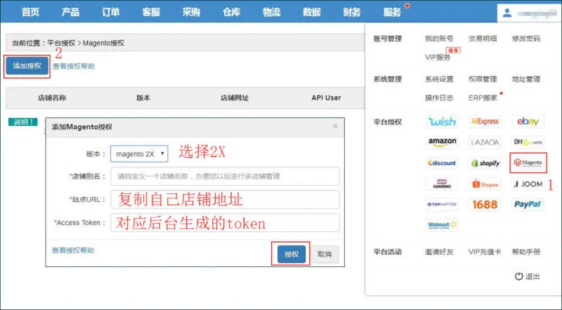 将magento的API授权给第三方ERP系统。有了这套完整的独立自建站后,通过一些站外引流或折扣促销方式可能要不了多久就会收获订单。magento功能强大,自然也少不了标准的API接口。批量处理订单时,登录后台,进行简单的API配置,获得API授权码。然后登录第三方ERP系统,比如店小秘 www.dianxiaomi.com 授权方式参考,即可完成订单处理。