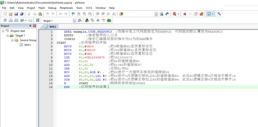 test1.1ARM数据处理指令寻址方式实验和ARM内存访问指令寻址方式实验中代码如下: