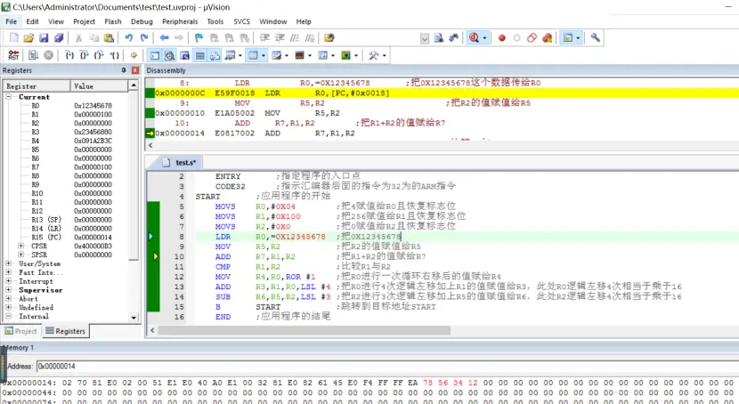 结果: 最终寄存器R8读数为0X000010,正好为1+2+3+10=16,所以正确实现该功能。