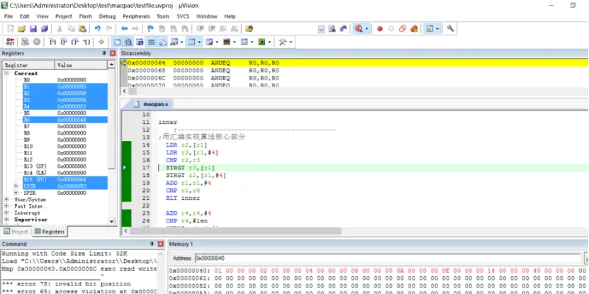 通过调试可以发现知道代码中的数据传送指令MOV;算术运算指令-加法指令ADD和减法指令SUB;以及比较指令CMP等数据处理指令在寄存器的数值和地址的变化,初步了解ARM的寻址方式以及数据传送方式。