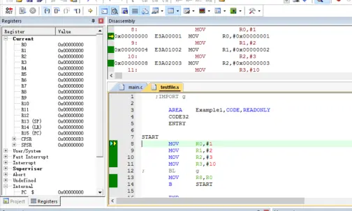 把“IMPORT ….注释后发现,编译调试时程序单步运行直接从汇编程序开始,说明无法调用C语言的main函数。IMPORT伪操作告诉编译器当前的符号不是在本源文件中定义的,而是在其他源文件中定义的,在本源文件中可能引用该符号,而且不论本源文件是否实际引用该符号,该符号都将被加入到本源文件的符号表中。