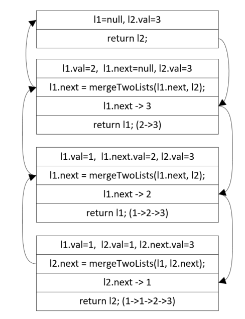 以l1 = 1 -> 2,l2 = 1 -> 3为例,其栈递归调用图如下: