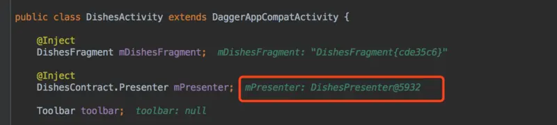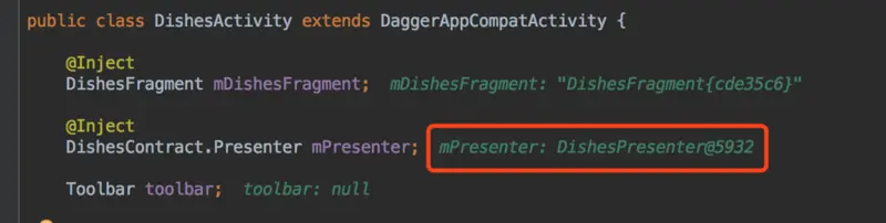 我们在DishesActivity中增加一句代码,作用时注入DishesPresneter对象。