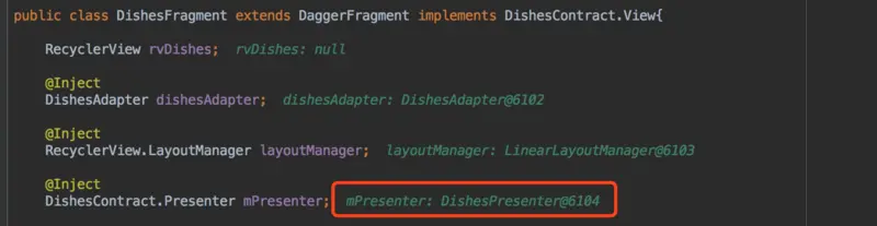 从上面的代码中,我们知道DishesFragment中也用同样的方式来注入过DishesPresneter对象,那么它们有什么区别的,我们通过调试功能来看下。