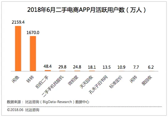 比达咨询监测数据显示,2018年6月,闲鱼活跃用户数为2159.4万人,依托58赶集的二手信息产品的转转6月活跃用户为1670.0万人。