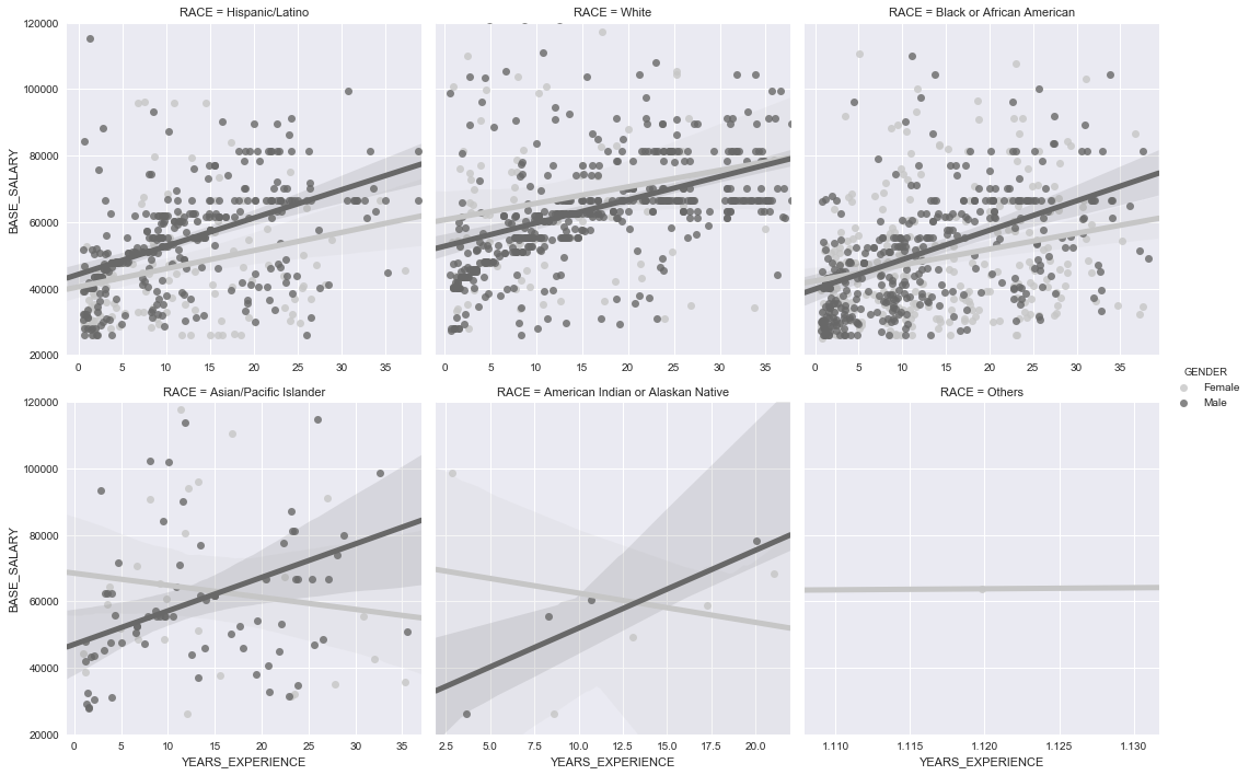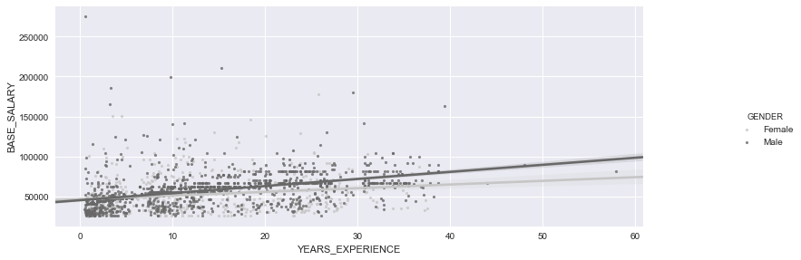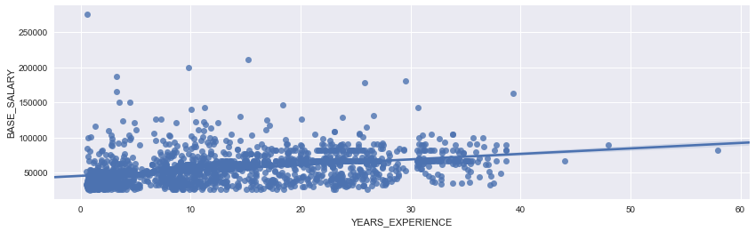 In[89]: grid = sns.lmplot(x='YEARS_EXPERIENCE', y='BASE_SALARY',