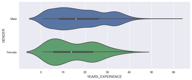In[93]: ax = sns.violinplot(x = 'YEARS_EXPERIENCE', y='GENDER', data=emp2)
