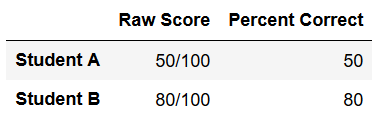 'Percent Correct':[50,80]}, columns=['Raw Score', 'Percent Correct'])