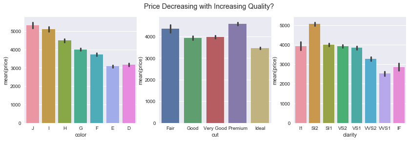 Out[98]: Text(0.5,0.98,'Price Decreasing with Increasing Quality?')