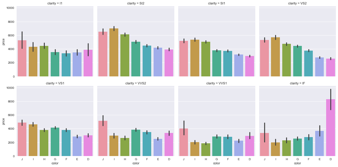 In[100]: sns.factorplot(x='color', y='price', col='clarity',