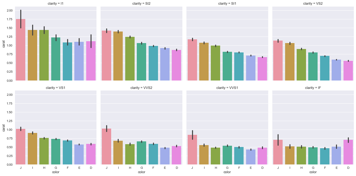 In[101]: sns.factorplot(x='color', y='carat', col='clarity',