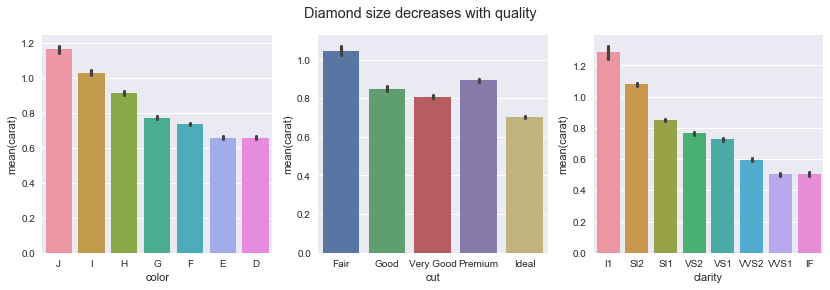 Out[102]: Text(0.5,0.98,'Diamond size decreases with quality')