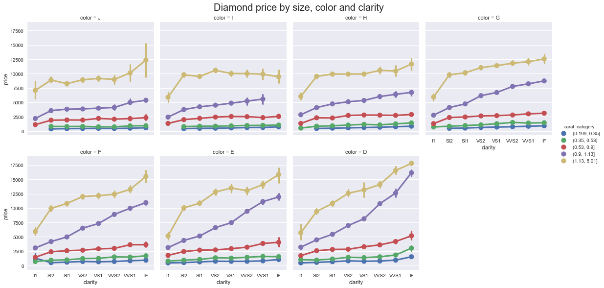 Out[103]: Text(0.5,1.02,'Diamond price by size, color and clarity')