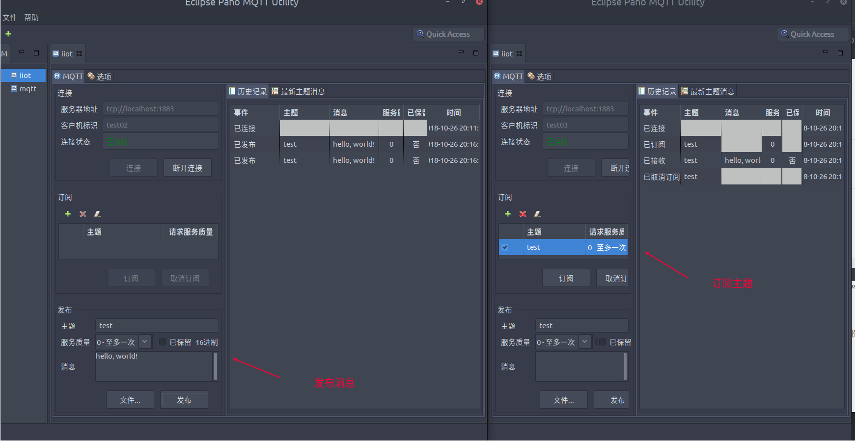 另起一个Eclipse Paho,订阅随意主题,例如test。另一个Eclipse Paho发布主题test。即可收到消息。