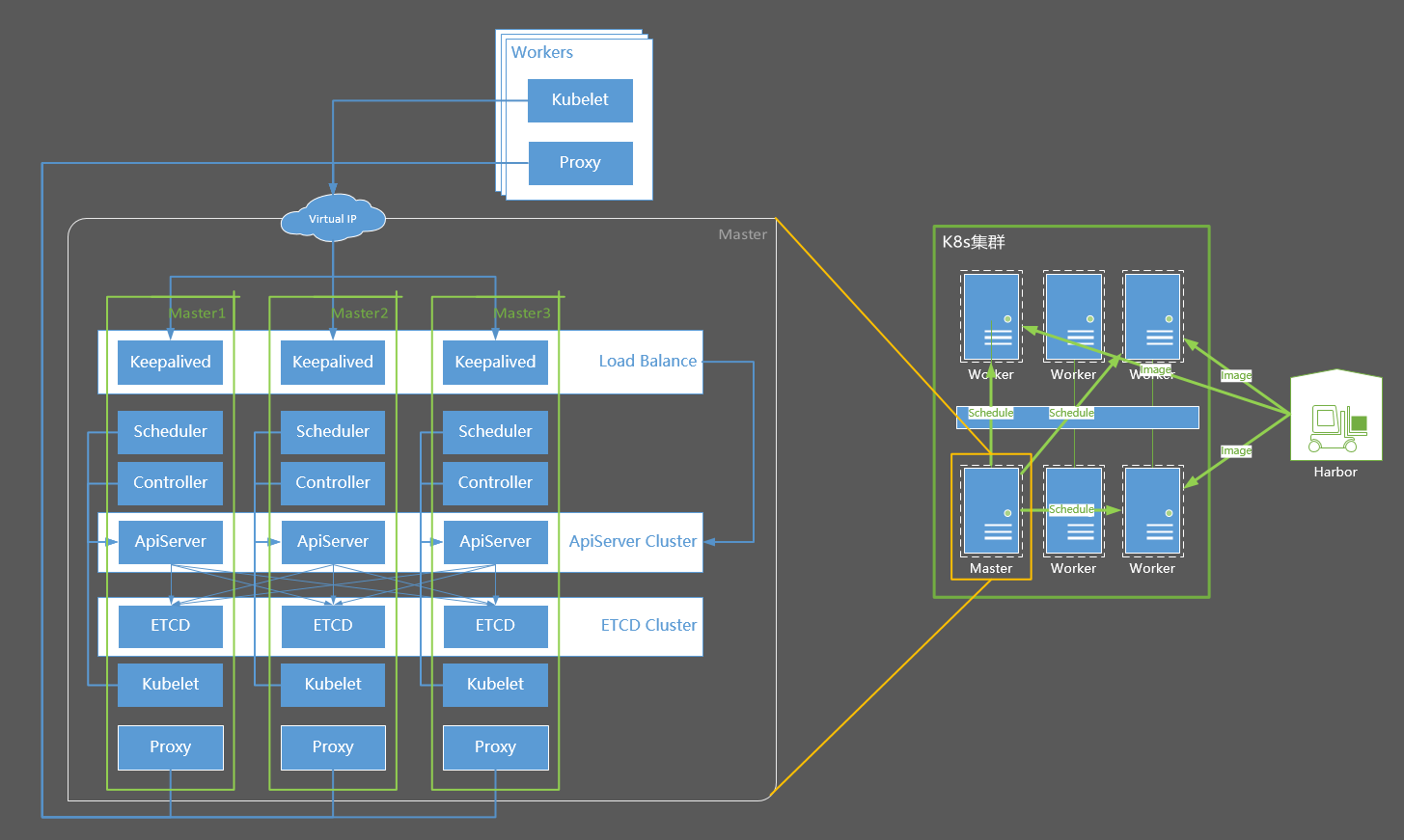 Worker(节点),也被称为Minion,即从属主机,是Kubernetes集群中的一台工作机器。每一个节点都包含了Pod运行所需的必要服务,例如docker/kubelet/kube-proxy。