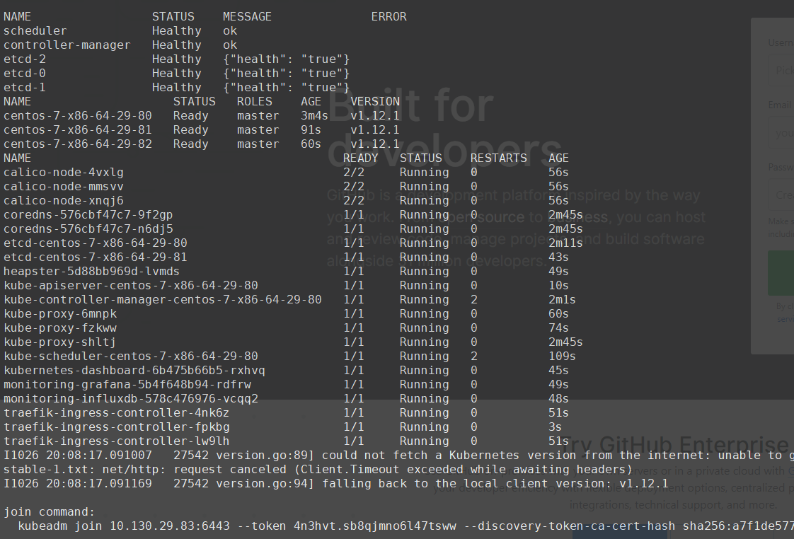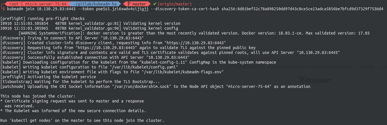 现在可以将各节点入编到集群中。join command是由kubeadm动态生成的,其基本形式如下
