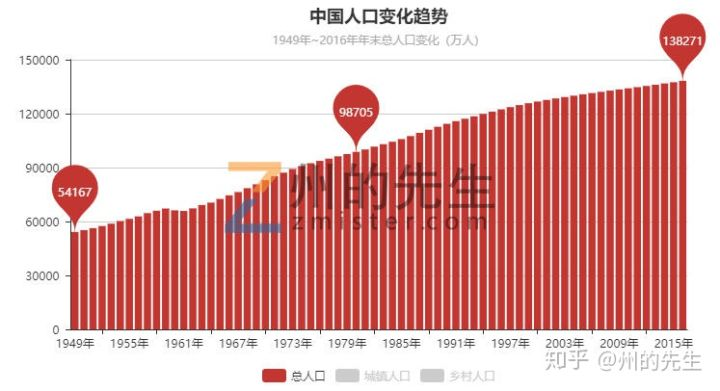我们将1949年至2016年共计67年的年末总人口数据通过柱状图的形式展示出来: