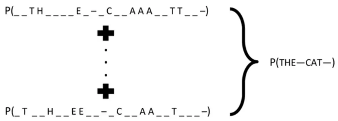 关于CTC模型,笔者认为可以这样理解,假设32 x 256的图片,数字串标签是"123",把图片按列切分(CTC会优化切分模型),然后分出来的每块再去识别数字,找出这块是每个数字或者特殊字符的概率(无法识别的则标记为特殊字符"-"),这样就得到了基于输入特征序列(图片)的每一个相互独立建模单元个体(划分出来的块)(包括“-”节点在内)的类属概率分布。基于概率分布,算出标签序列是"123"的概率P(123),当然这里设定"123"的概率为所有子序列之和,这里子序列包括'-'和'1'、'2'、'3'的连续重复,如下图所示: