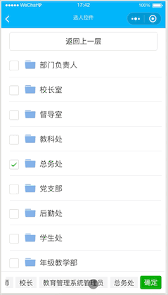 什么意思呢?假如有两层,A 和 B,B 是 A 的下一层数据,即 A 是 B 的父节点。在 A 中选中了一个部门 校长室,点击下一层到 B,在 B 中又选了两个人 张三 和 李四,这时底部 footer 里显示的应该是三个: 校长室、 张三 、 李四。此时点击 footer 的 张三 , footer 会把 张三 删除,中间列表中 张三 会被置为未选中状态,这没问题。但点击 footer 的 校长室 , 在 footer 中是把 校长室 删除了,但再返回到上一层时,中间列表中的 校长室 依然是勾选状态,因为此时没有更新原始数据树 originalList。如果觉得这是个 bug, 可以加个更新 originalList 的操作。这样就要遍历 originalList 的每个元素判断与本次删除的 id 是否相等,然后改变 checked 值,如果数据量很大,会非常慢。我做了妥协……
