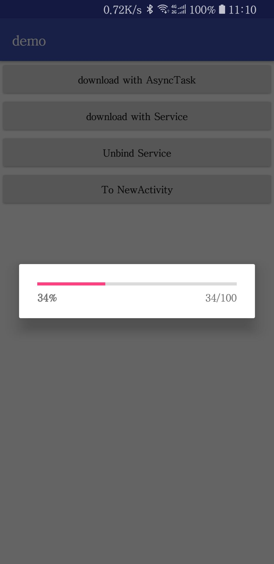 由于不太方便录屏和传gif图,我这里就简单说下会发生的事情:进度框会再度弹出,这没什么问题,但是进度条会停留在0%不动,直到一段时间之后弹出Toast显示下载完成,接着进度条开始慢慢增加,当达到百分之百时再次弹出Toast提示下载完成。