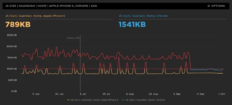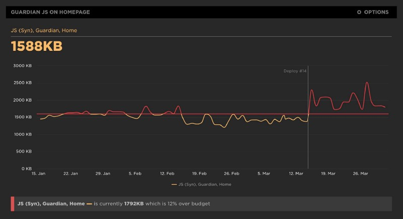 下面是一个数量指标 —— 在 SpeedCurve 上 The Guardian’s 桌面网站的 JS 大小。它在预算范围内以黄色高亮显示,在超出预算时以红色显示。