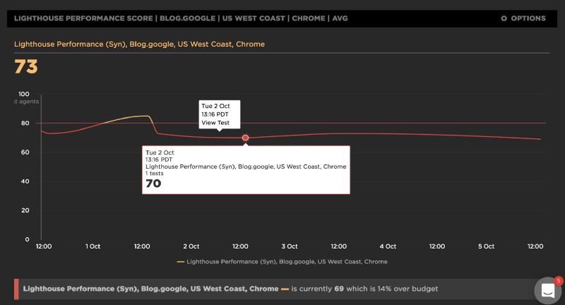 例子里以 80/100 的预算追踪了 blog.google 在 Lighthouse 上的性能分数。红线表示超出了预算。