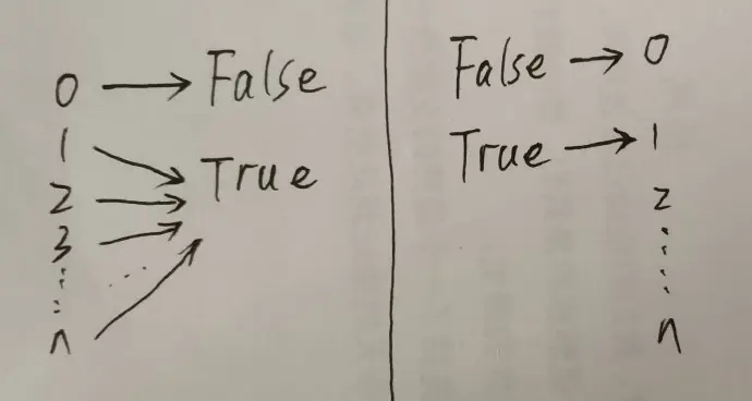 接下来,还是一个铺垫,这次是进阶知识。零值(含整数0、浮点0.0、虚数0j等)可以映射为False,其它非零值映射为True;但是,反过来,False唯一映射整数0,True唯一映射整数1。