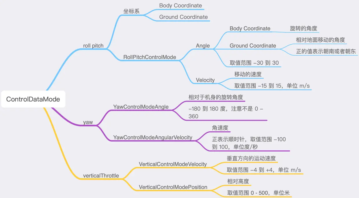 在切换到程序控制运动模式后,就可以发送控制指令了。和遥控器上的两个摇杆控制能力一样,你可以控制飞行器的升降、水平旋转、水平方向的前进后退、向左向右。 运动指令的参数是一个 DJIVirtualStickFlightControlData 类型的结构体,前面提到可以控制四个维度的运动,因此有四个浮点型的值可以设置:
