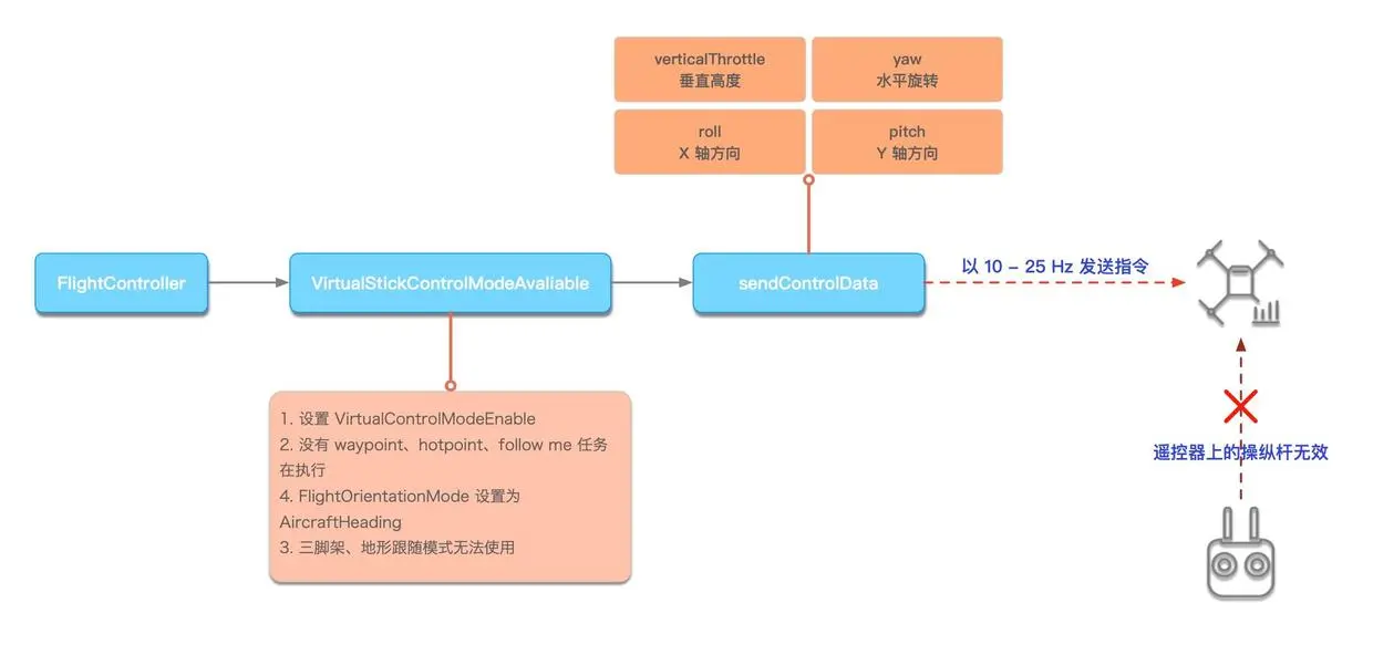 这是非常非常重要且被忽略的一点。这个设计应该也是出于安全考虑,希望飞行器在某个时刻只有一个明确的控制权,如果一个时刻遥控器发出往左,程序控制往右。两个指令都拥有一样的优先级,不知道谁优先。所以在控制运动完成后切记把 VirtualStickMode 设置为 false。