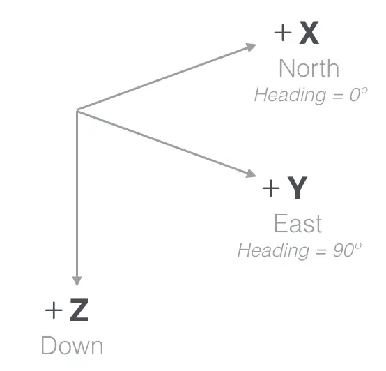 水平方向 X、Y 轴的运动的控制模式是一致的,因此组合在一起,枚举名叫 RollPitchControlMode。 在设置水平运动的值时需要先确定此时选择的参考坐标系。为了更方便的控制姿态,DJI 提供了两个坐标系:Body Coordinate 和 Ground(World) Coordinate。