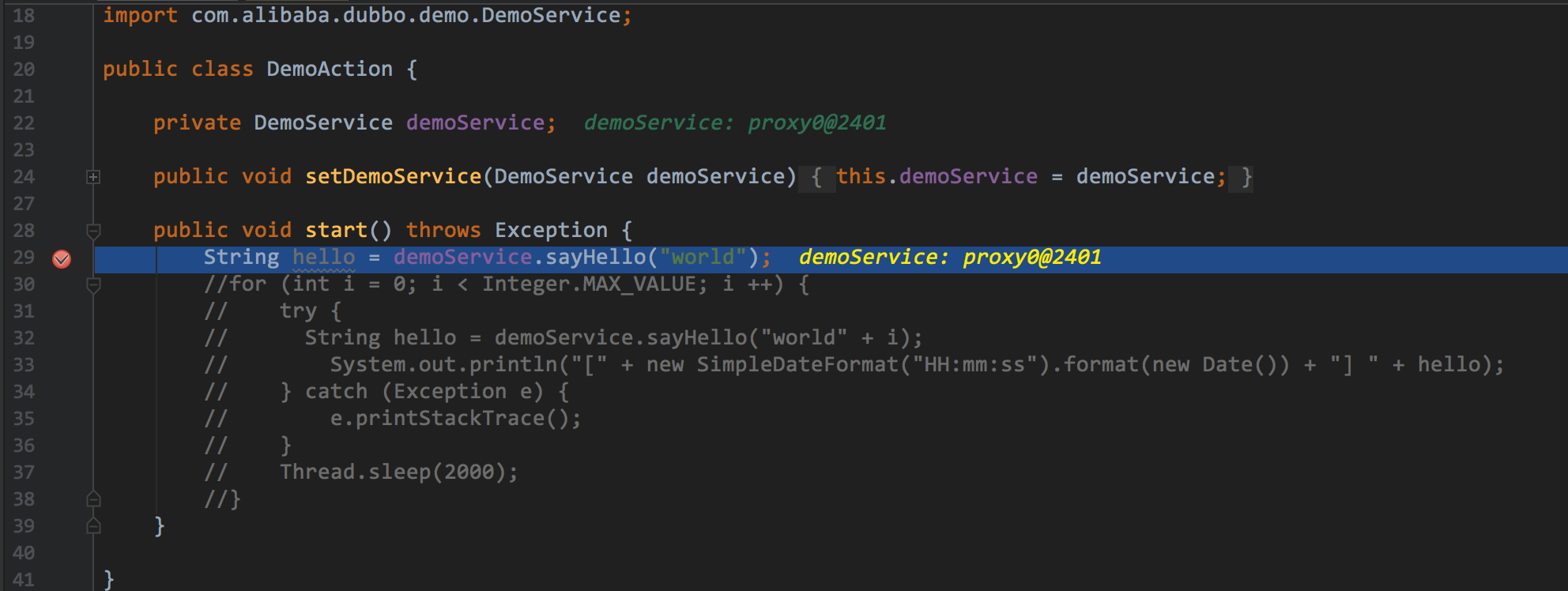 这次示例选用的源码用dubbo-demo的dubbo-demo-consumer,如果对dubbo原理有些简单的了解就知道,他给接口注入的不是接口的实现类,而是一个代理类,如下图