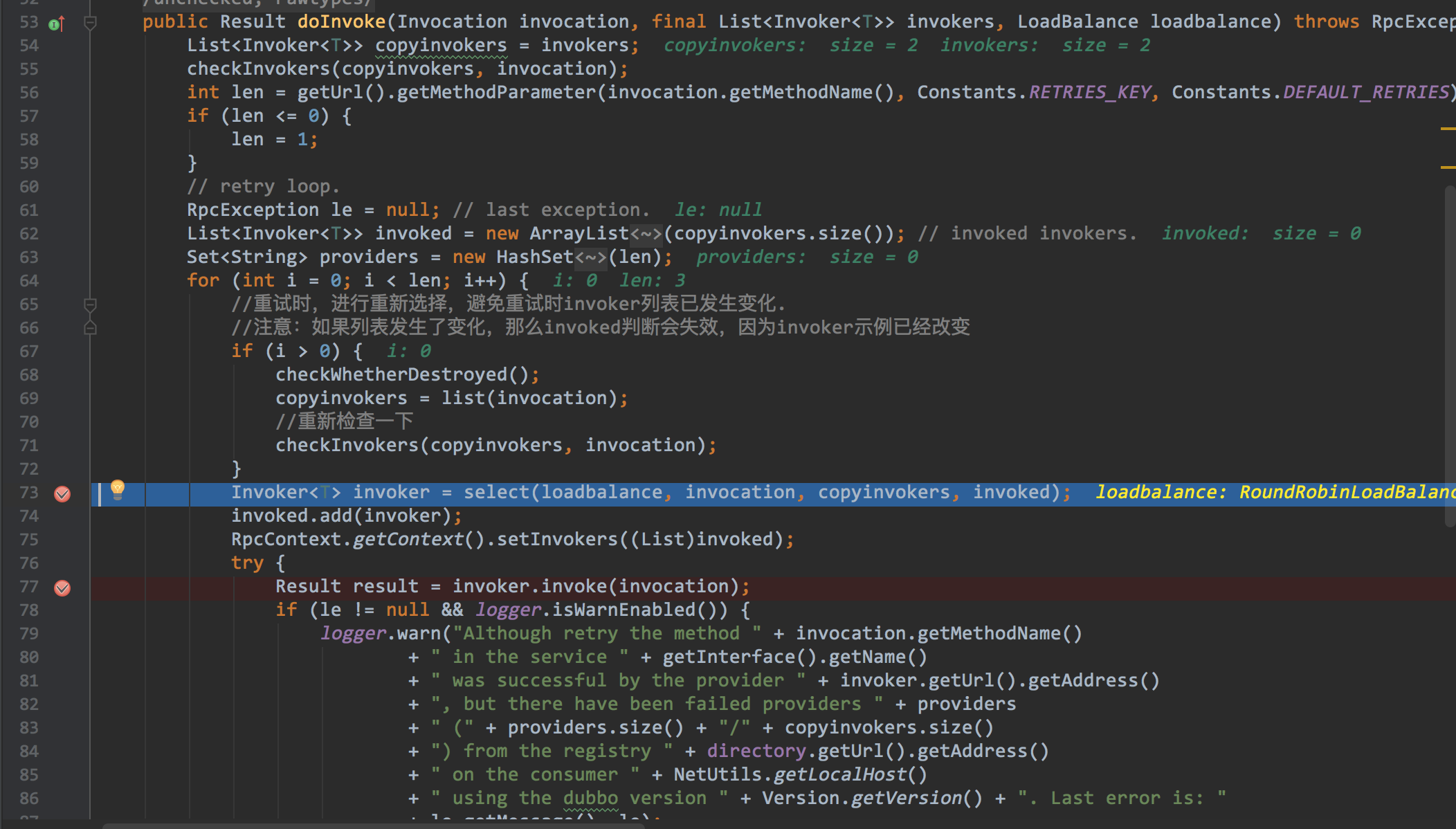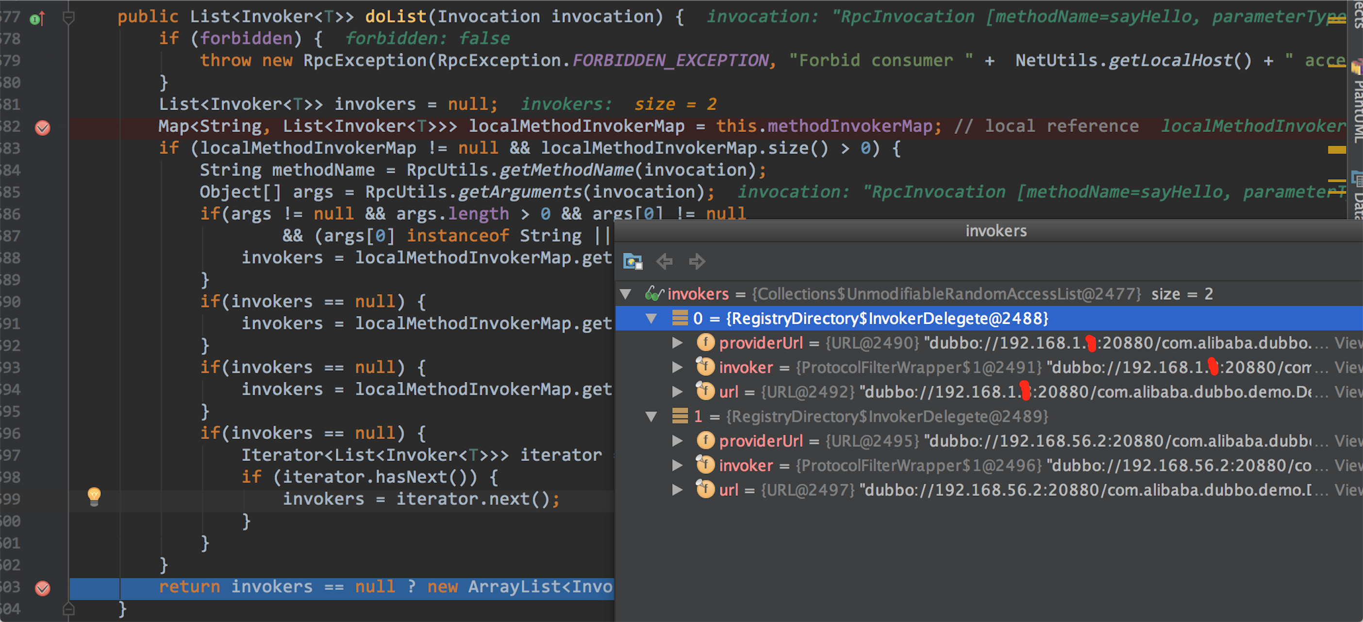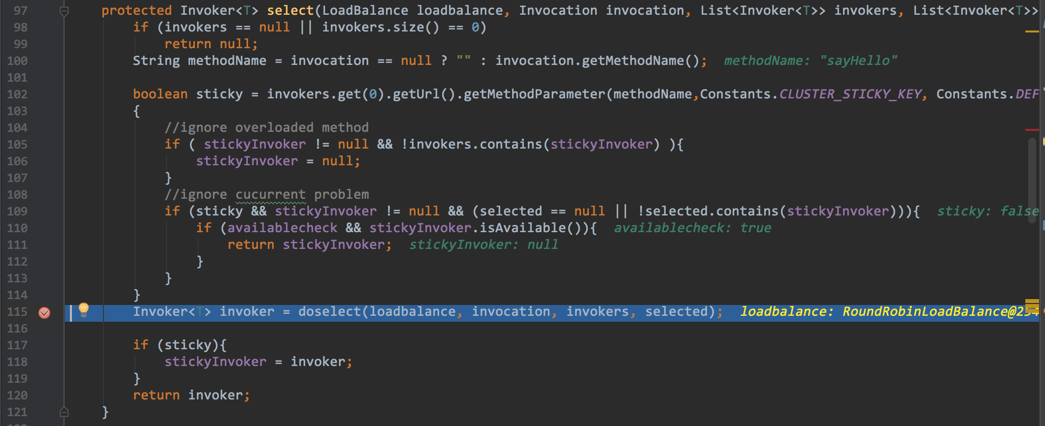 根据前面我们知道,现在已经有两个备选的invokers,但是究竟哪一个能执行,这个需要LoadBalance来决定.这里涉及到了一定的算法,后面我也会有一篇文章加以介绍.剧透一下,这个在2.5.4的版本中,这个算法还是存在一些小的bug,此时我们的位置是序号13