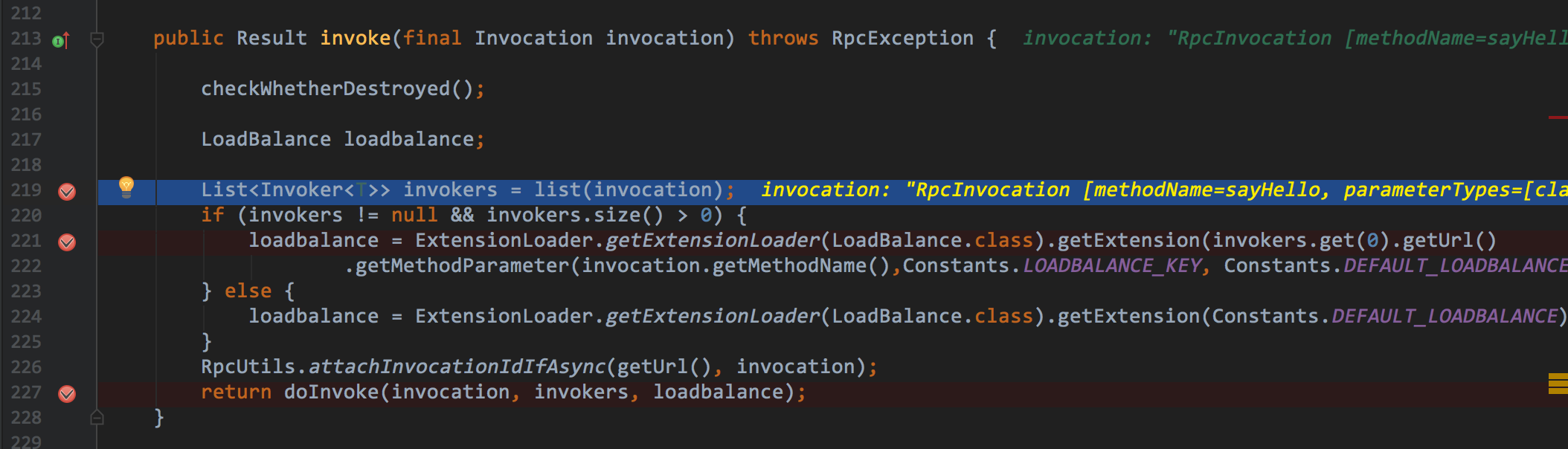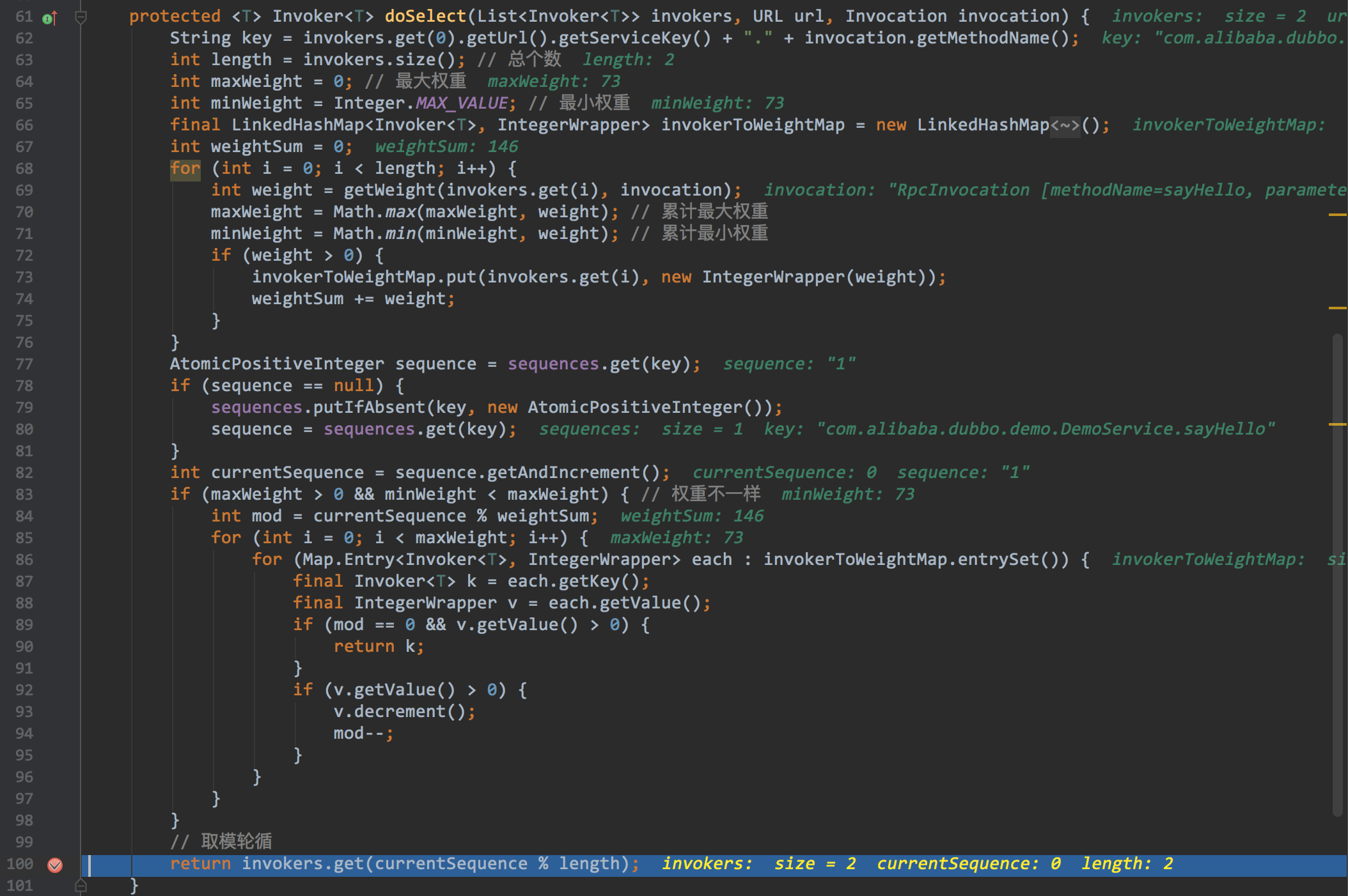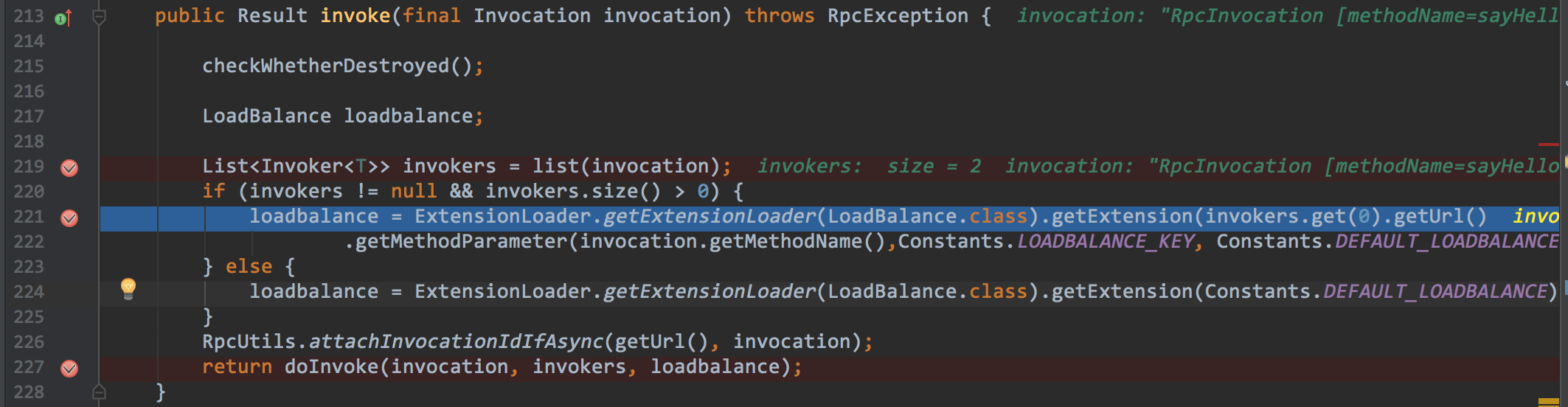 根据前面我们知道,现在已经有两个备选的invokers,但是究竟哪一个能执行,这个需要LoadBalance来决定.这里涉及到了一定的算法,后面我也会有一篇文章加以介绍.剧透一下,这个在2.5.4的版本中,这个算法还是存在一些小的bug,此时我们的位置是序号13