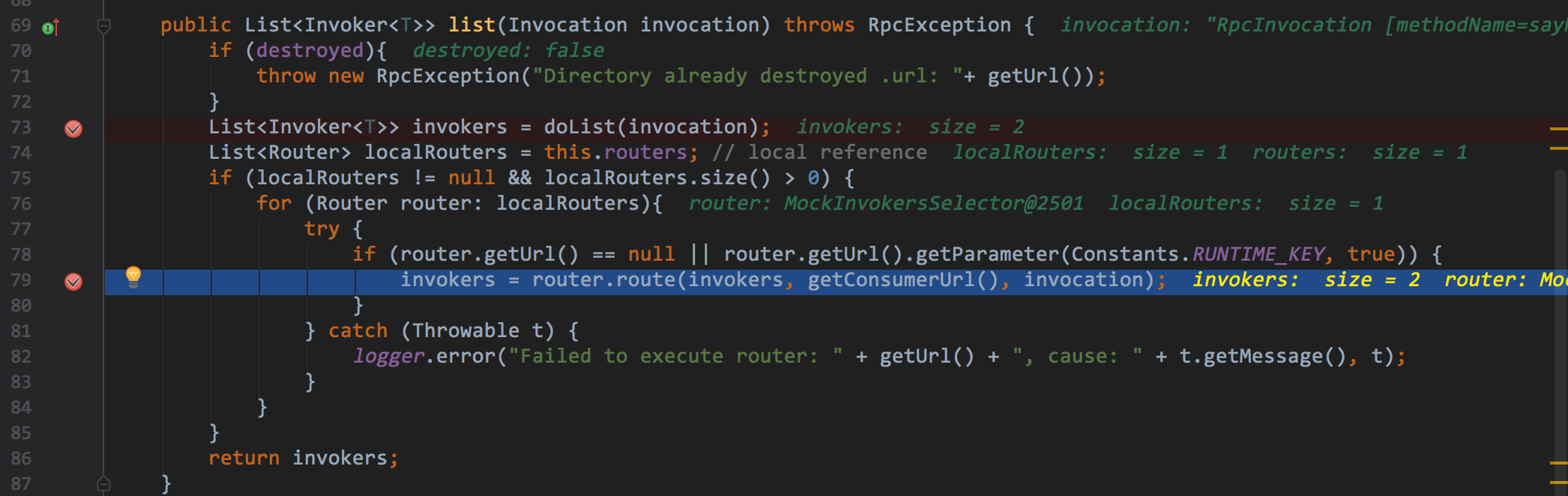 Router中,将上一步的全部invokers挑选出能正常执行的invokers