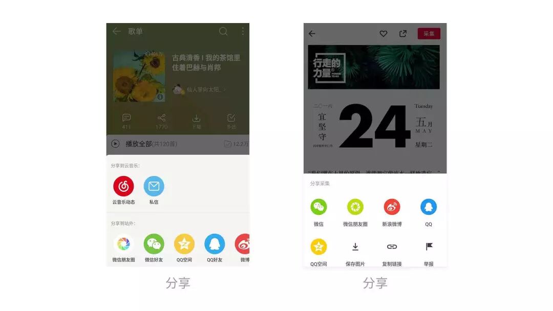 这时可采用宫格模式。宫格模式适用于选项非常多的情况,并且能以图标形式展现选项,常见于分享到其他社交App或使用第三方App打开文件的场景。使用宫格模式建议将相关选项分组,如果某组的数量太多,可以在屏幕右边缘露出部分图标,暗示可以横向滑动查看更多选项。