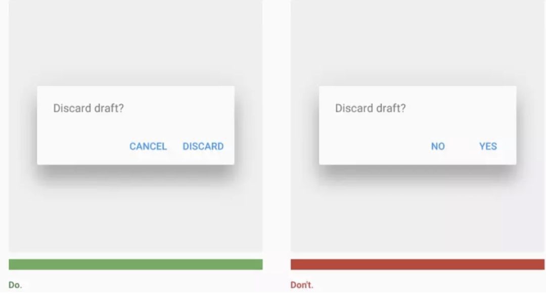 左边的警对话框,按钮文案“删除”明确地告知了操作的结果;右边的按钮文案,回答了上面“删除草稿吗?”这个问题,但是没有告知操作的结果(其实也就是告知的不直接),所以不被建议使用。(来自MD规范)