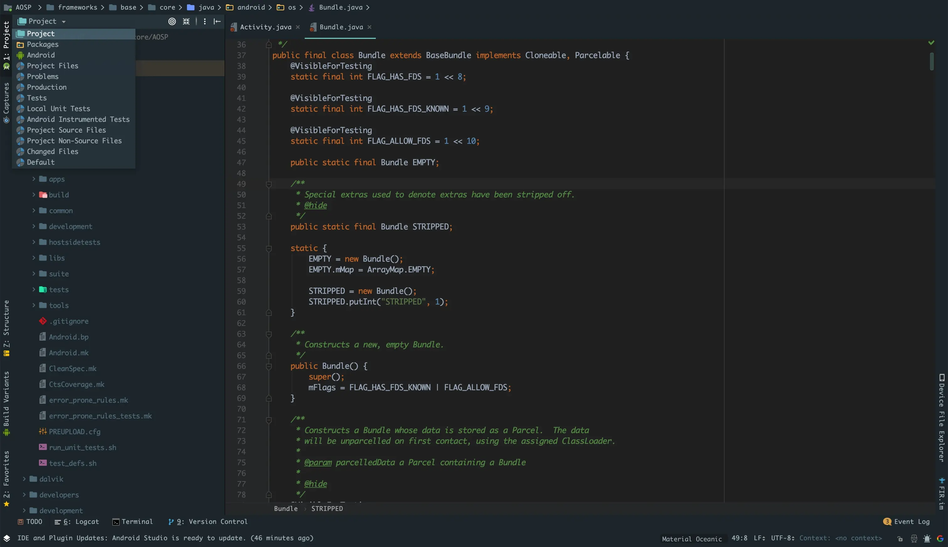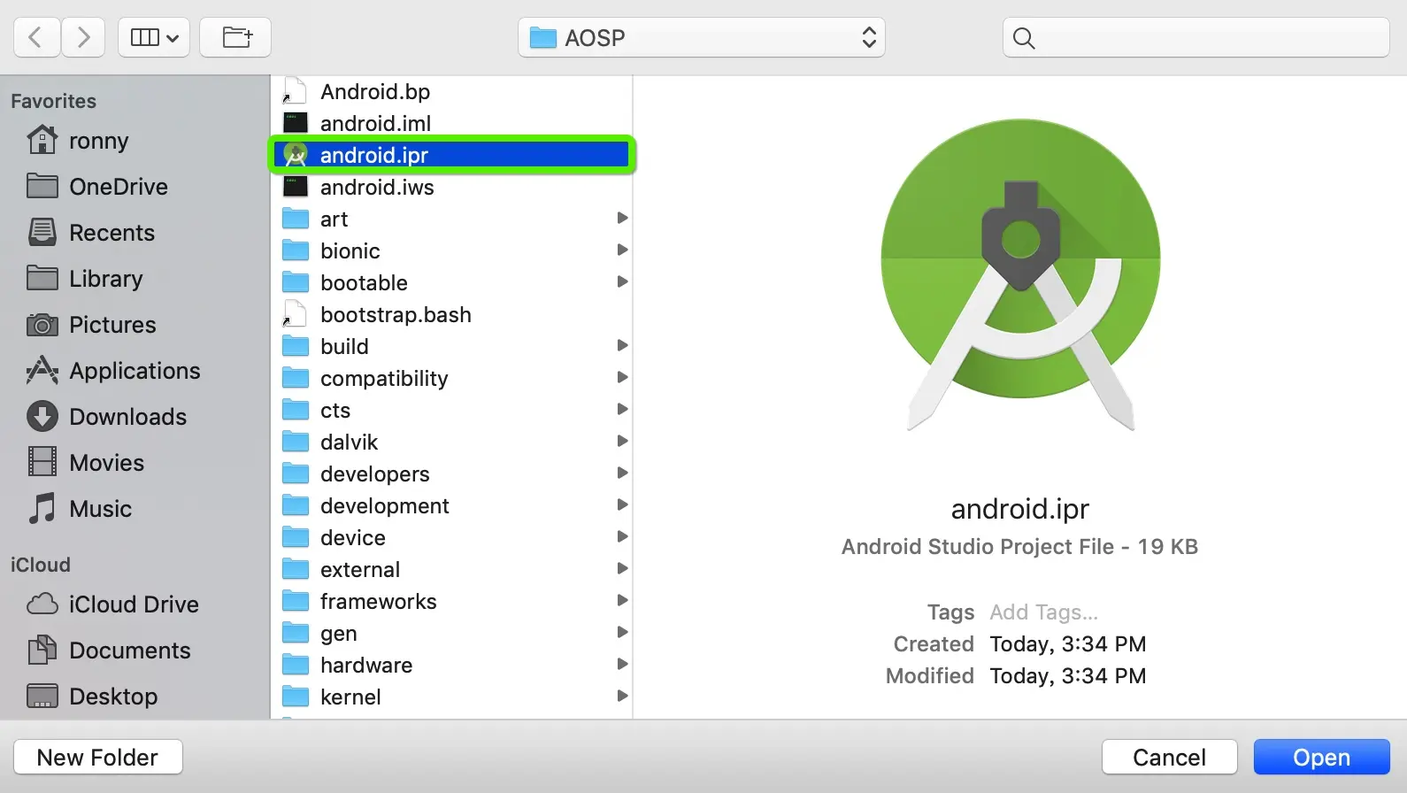 准备工作已经做完了下面就可以像导入一个Android项目一样导入AOSP目录了。进入AOSP目录选择被识别出来的.ipr文件,然后点击open即可。