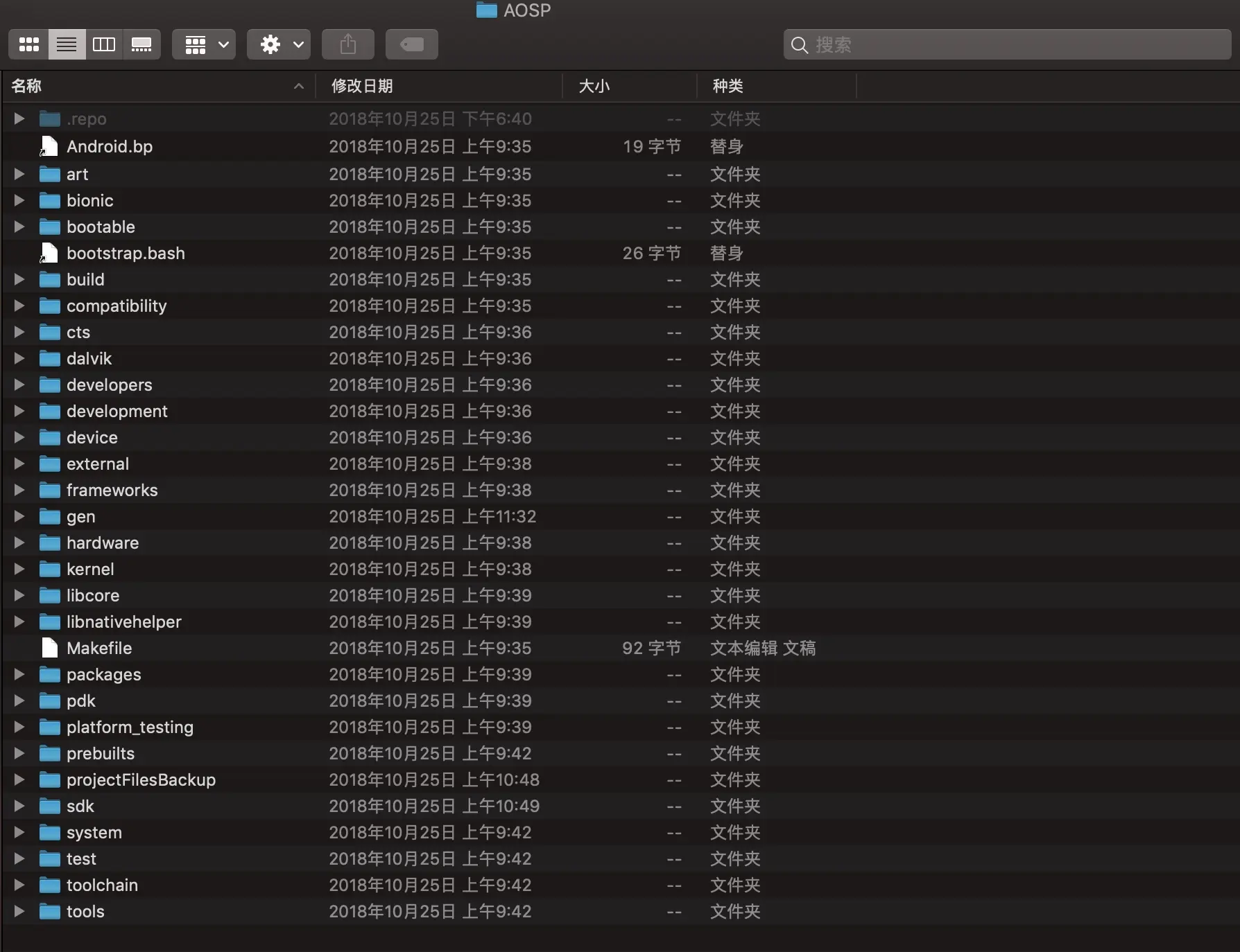 下载完成以后会得到一个37g的以aosp-latest命名的tar文件,然后将其解压可以看到里面有一个.repo的隐藏文件(mac 下载查看隐藏文件的快捷键Command+Shift+ .)