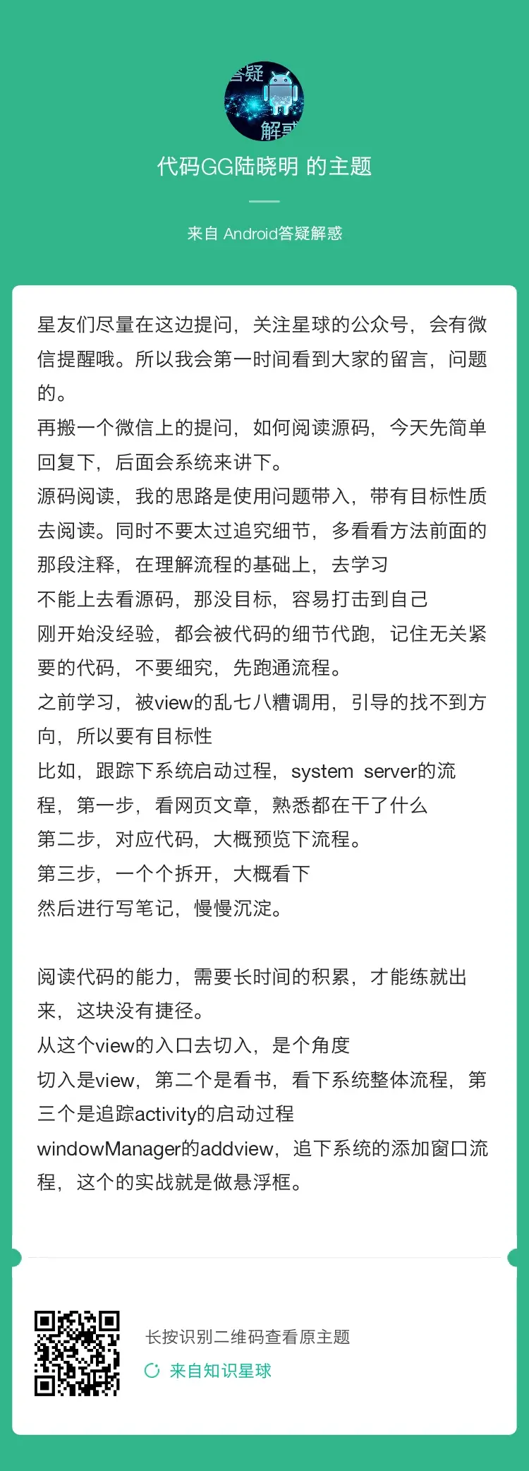 最后,要感谢一下「代码GG之家」的明哥,8年Android手机开发的老大哥。在源码阅读环境搭建和源码阅读方式与技巧上都给我很大的帮助。这里我把明哥在星球里的回答贴出来分享一下: