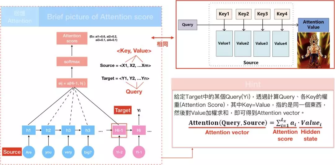 输入句中的每个文字是由一系列成对的 <地址Key, 元素Value>所构成,而目标中的每个文字是Query,那麼就可以用Key, Value, Query去重新解释如何计算context vector,透过计算Query和各个Key的相似性,得到每个Key对应Value的权重係数,权重係数代表讯息的重要性,亦即attention score;Value则是对应的讯息,再对Value进行加权求和,得到最终的Attention/context vector。