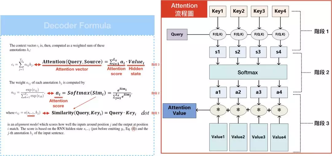 有了Key, Value, Query的概念,我们可以将attention model中的Decoder公式重新改写。1. score e_{ij}= Similarity(Query, Key_{i}),上一篇有提到3种计算权重的方式,而我们选择用内积。2. 有了Similarity(Query, Key_{i}),便可以透过softmax算出Softmax(sim_{i})=a_{i},接著就可以透过attention score a_{i}乘上Value_{i}的序列和加总所得 = Attention(Query, Source),也就是context/attention vector。