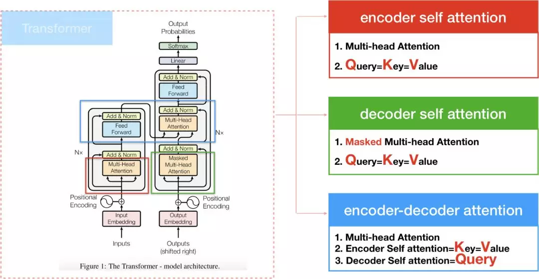 “The transformer”在计算attention的方式有三种,1. encoder self attention,存在於encoder间. 2. decoder self attention,存在於decoder间,3. encoder-decoder attention, 这种attention算法和过去的attention model相似。