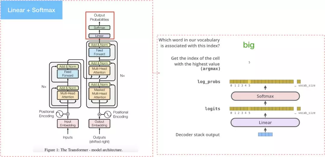 Decoder最后会產出一个向量,传到最后一层linear layer后做softmax。Linear layer只是单纯的全连接层网络,并產生每个文字对应的分数,softmax layer会将分数转成机率值,最高机率的值就是在这个时间顺序时所要產生的文字。