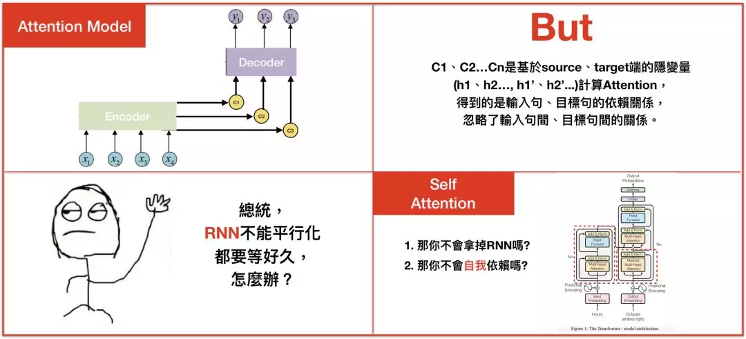 系列一中,我们学到attention model是如何运作的,缺点就是不能平行化,且忽略了输入句中文字间和目标句中文字间的关係。
