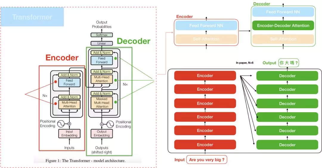 “The transformer”和Seq2seq模型皆包含两部分:Encoder和Decoder。比较特别的是,”The transformer”中的Encoder是由6个Encoder堆积而成(paper当中N=6),Deocder亦然,这和过去的attention model只使用一个encoder/decoder是不同的。
